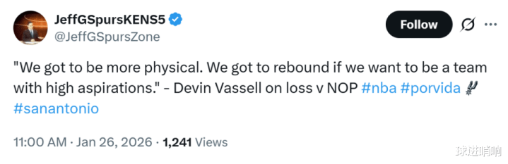 赛后瓦塞尔也承认这一点:“我们必须打得更有身体对抗强度,如果我们想要成为一支目标远大的球队,那就必须把篮板抢下来,我们早就知道鹈鹕队今晚要怎么打,他们想要赢球一定会疯狂冲抢篮板、打得更有身体对抗,而我们没有交出与之相对应的强度。”