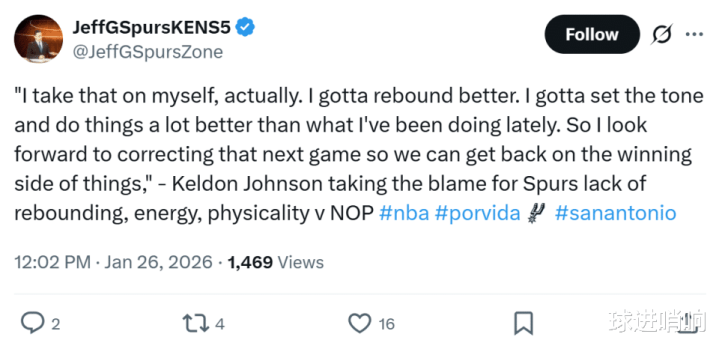 凯尔登约翰逊给出相同说法,主动揽责道:“实话实说,我把这归咎于自己,必须在篮板上做得更好,我要主动为球队定下基调,在各个方面都要做得更好,我已经开始期待下一场比赛中纠正这些问题,这让我们才能重新回到胜利的轨道上。”
