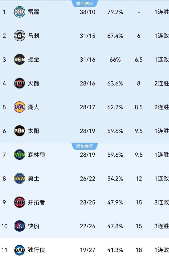 目前为止,快船以22胜24负排名西部第十,已抹平与第九的开拓者胜差数,落后第八的勇士3个胜场,领先第11的独行侠3个胜场,最起码锁定附加赛名额应该没啥问题了。