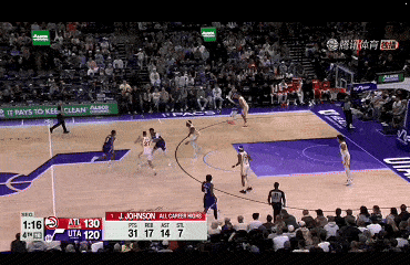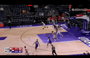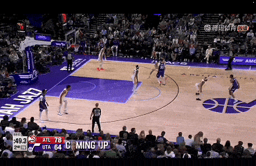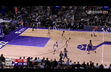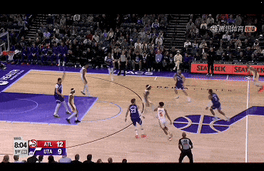 爵士强侧发动Wide pin down(宽掩护),在马尔卡宁突破时森萨博45cut带走防守,处于弱侧的贝利接球后顺势出手三分。
