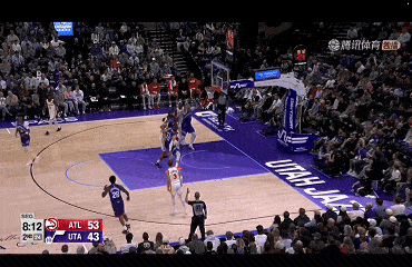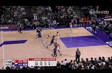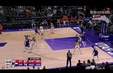 爵士五外站位,乐福为贝利设置pindown(下掩护),后者接球后直接出手三分。