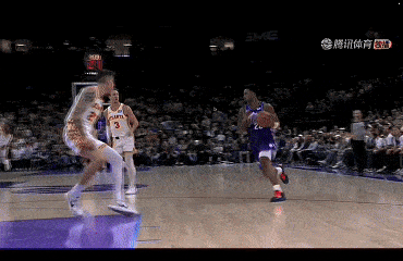 贝利兜出与努尔基奇做手递手,后者向下移动为森萨博做pindown(下掩护);随后贝利分球给兜出森萨博,助攻其三分得手。
