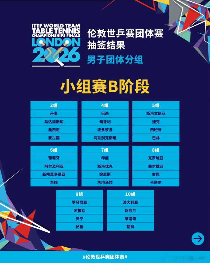 2026年ITTF国际乒联伦敦世锦赛团体赛抽签仪式已经于北京时间26日晚结束。伦敦世锦赛团体赛抽签结果已经出炉。