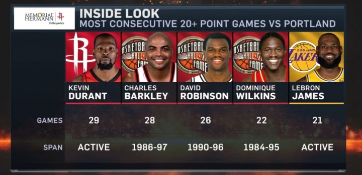 赛前对开拓者连续20+纪录,杜兰特连续29场,打完半场已将纪录延至30场。
