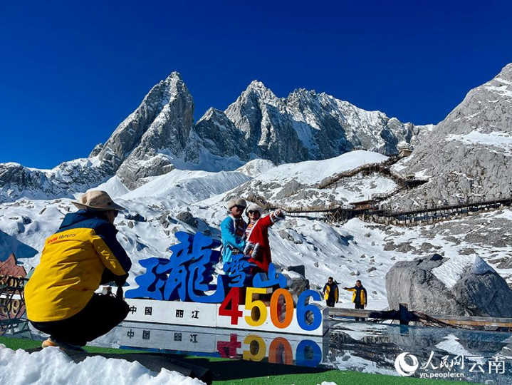 游客在玉龙雪山打卡。人民网记者程浩摄