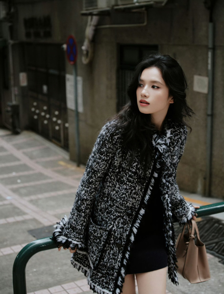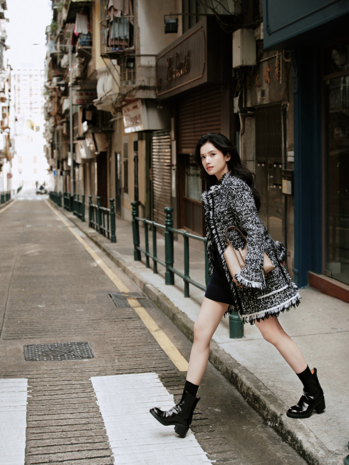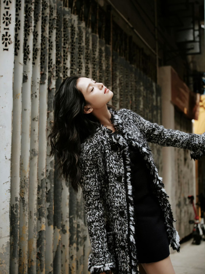 镜头里的她,长发被巷口的风轻轻掀起,黑白呢绒的毛边顺着动作轻晃,像把老电影里的质感穿在了身上。这件外套是整套造型的灵魂:粗花呢的肌理自带复古滤镜,黑白撞色消解了冬日的沉闷,而边缘的流苏设计则添了几分随性——既不会像纯黑大衣那样显刻板,也比亮色棉服多了“耐看”的底气。内搭的黑色短裙刚好露出纤细的脚踝,配上粗跟短靴,既保留了女性的柔媚,又用利落的线条中和了呢绒的厚重,哪怕是在10℃左右的天气里,也能在“保暖”与“好看”之间找到平衡。