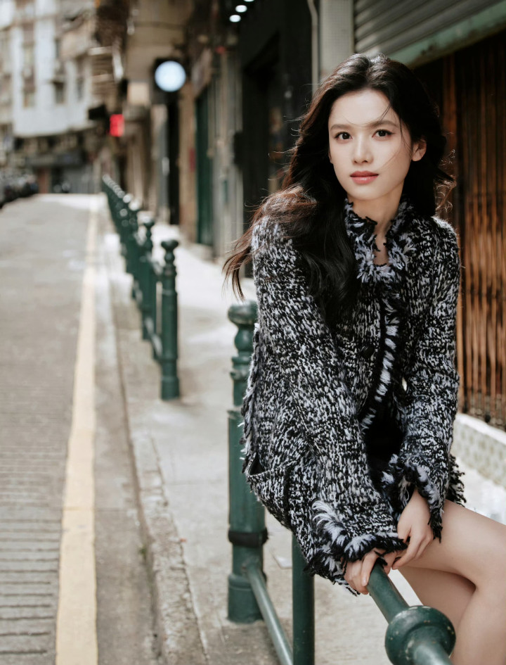 当张婧仪穿着黑白流苏呢绒外套,斜倚在澳门水坑尾巷的绿瓷砖墙前时,深冬的冷意仿佛都被她身上那股“漫不经心的精致”揉碎了。这组港风街巷写真里,她没裹着臃肿的羽绒服,也没堆砌复杂的色彩,仅用一件毛边纹理的黑白外套、一条极简黑裙,便把冬日穿搭的“高级感”拆解得淋漓尽致——原来冬天的美,从不是和温度较劲,而是让气质在松弛里生长。