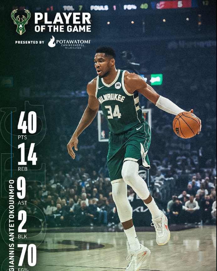 字母哥今天依旧表现非常出色,打了33分钟,20投14中,三分1中1,罚球16中11,空砍全场最高的40分外加14篮板9助攻2抢断2盖帽。前两场比赛,字母哥就分别砍下了37分14篮板5助攻和31分20篮板7助攻的豪华数据,即今天又拿到40+准三双,由此成为历史首位在赛季前三战场都砍下至少35+15+5的球员。赛季前3场,字母哥加起来一共砍下108分48篮板21助攻,场均也可以得到36分16板7助,状态相当火热。