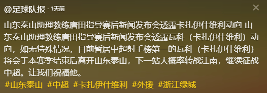 该报在官方社媒中发布了山东泰山助理教练唐田,在新闻发布会中透露卡扎伊什维利后续动向的视频并写道:“如无特殊情况,目前暂居中超射手榜第一的瓦科(卡扎伊什维利)将会于本赛季结束后离开山东泰山,下一站大概率转战江南,继续征战中超。”